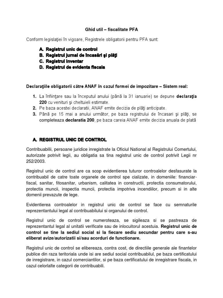 vizitati articolul complet aici : https://de.scribd.com/document/359577014/Cerere-Pentru-Registrul-Unic-de-Control Certificat de atribuire a numărului unic de identificare a aparatelor de marcat electronice fiscale (opanaf 4156/2017). Comisia europeană a aprobat solicitarea ministerul finanțelor, adresată în baza cadrului temporar pentru măsuri de ajutor de stat, de a prelungi programul imm invest românia și subprogramul agro imm invest, începând cu 1 iulie 2021 până la data de 31 decembrie 2021, și de a. May 05, 2021 · amenda se aplică de către organele de control din cadrul anaf.